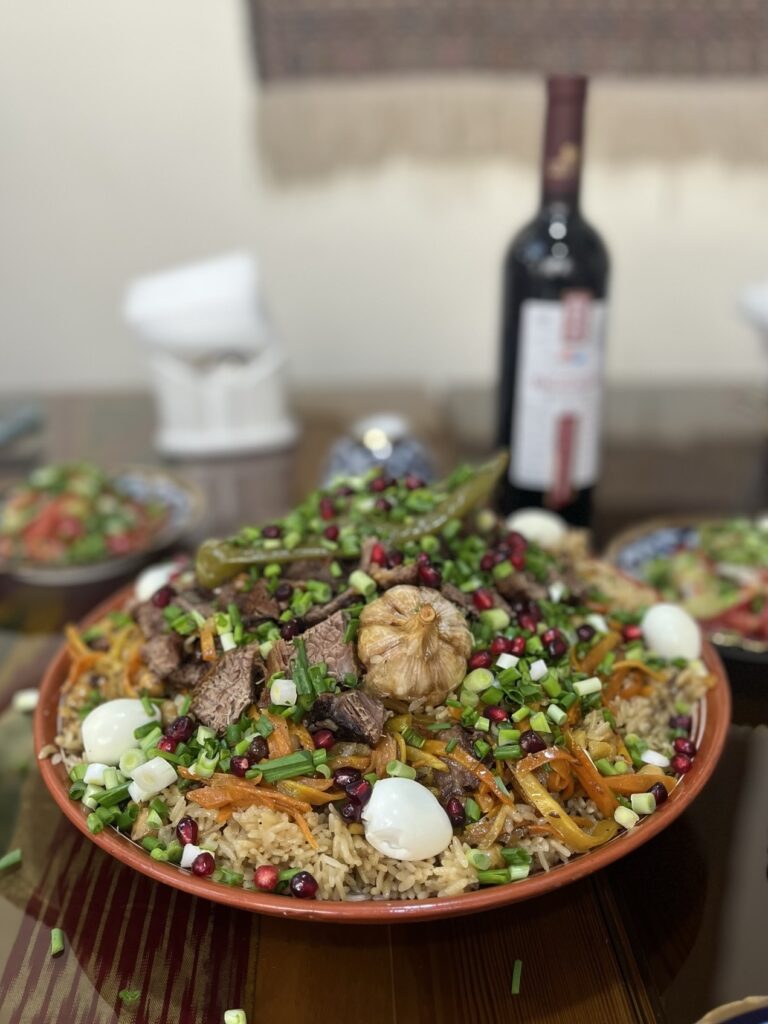 El plov es el plato nacional y símbolo del país. Consiste en un arroz pilaf cocinado con carne (generalmente cordero o res), zanahorias en tiras, cebolla, garbanzos o pasas (según la región) y especias suaves como comino y pimienta negra. Cada ciudad tiene su estilo; el plov de Samarcanda y el plov de Bujará son especialmente famosos