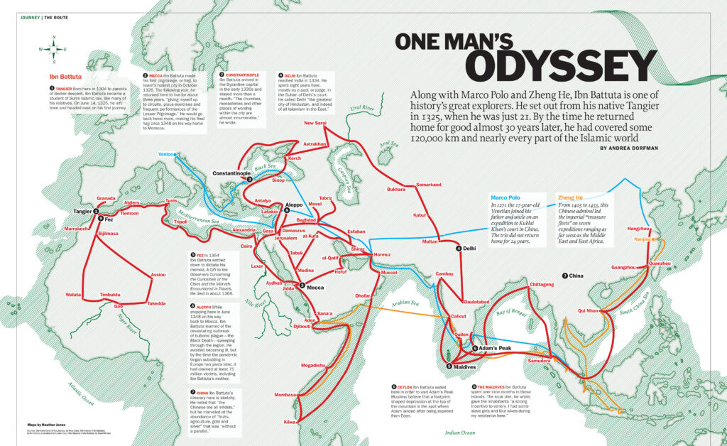Ibn Battuta, viajero marroquí musulmán, pasó por el actual Oriente Medio y recorrió toda la Ruta de la Seda entre 1325-1354. Muhámmad ibn Battuta inició su viaje con intención de realizar el hajj o peregrinación a La Meca. Partió de Tánger, según su crónica en 1325, «solo, sin compañero con cuya amistad solazarme ni caravana a la que adherirme». Tenía entonces 22 años. No volvería hasta 24 años más tarde, después de haber recorrido más de 120 000 kilómetros, de un extremo a otro del mundo musulmán y fuera de él.